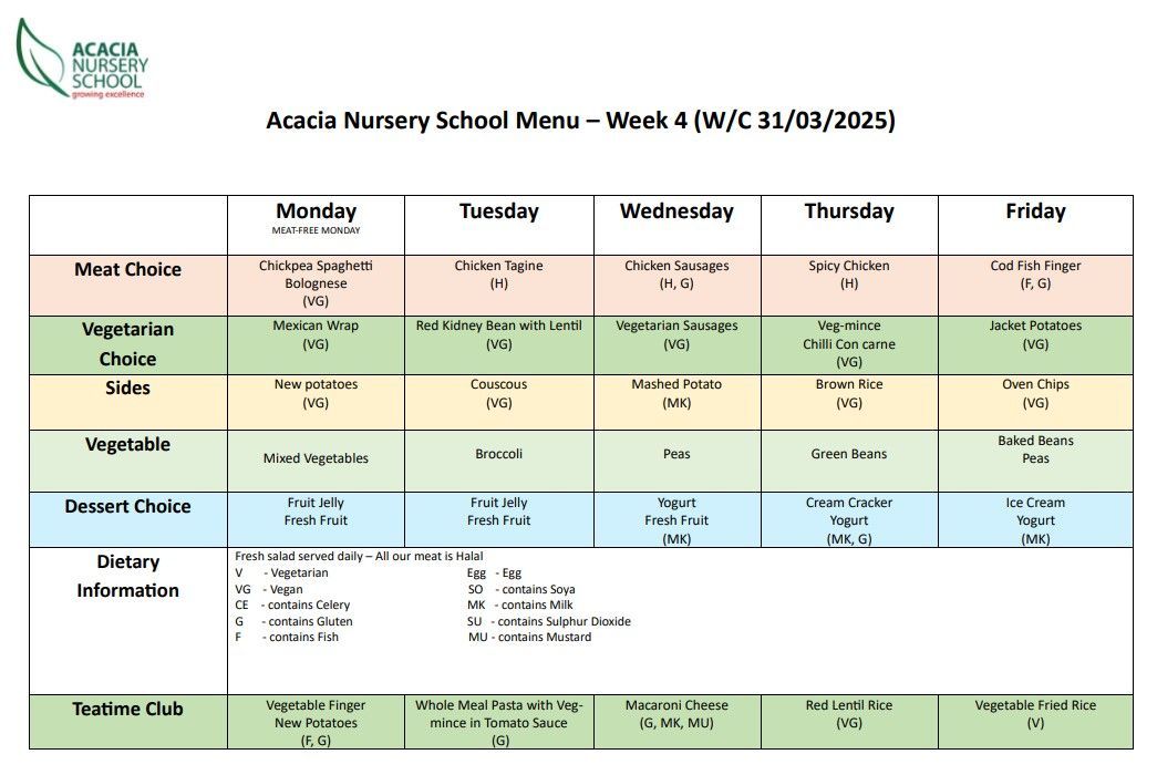 We now offer cooked lunches which are charged at £2.20 a day. There is always a vegetarian option available and all meat is halal. Menus are sent to parents each week.